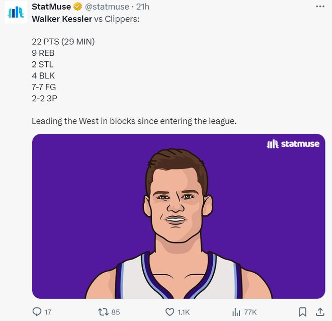 沃克-凯斯勒在揭幕战VS快船的比赛中,29分钟,7中7,三分2中2,拿到22分9篮板2抢断4盖帽,命中率100%,真实命中率高达120%,凯斯勒面对祖巴茨是丝毫不怵,关键是他练出了三分投射。